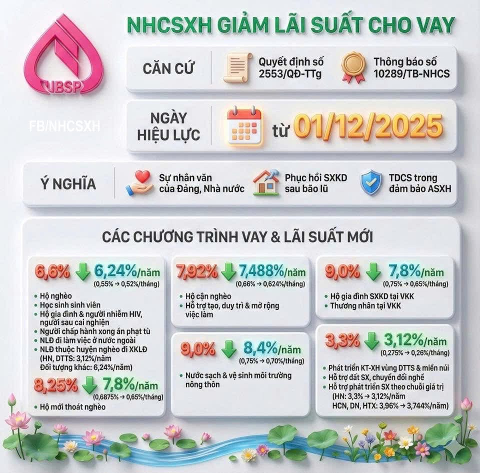 Thực hiện Quyết định số 2553/QĐ-TTg ngày 21 tháng 11 năm 2025 của Thủ tướng Chính phủ về việc điều chỉnh giảm lãi suất cho vay một số chương trình tín dụng chính sách tại Ngân hàng Chính sách xã hội: lãi suất cho vay hộ nghèo, cho vay học sinh, sinh viên điều chỉnh giảm từ 6,6%/năm (0,55%/tháng) xuống 6,24%/năm (0,52%/tháng); lãi suất cho vay hộ gia đình sản xuất, kinh doanh tại vùng khó khăn, cho vay thương nhân hoạt động thương mại tại vùng khó khăn, điều chỉnh giảm từ 9,0%/năm (0,75%/tháng) xuống 7,8%/năm (0,65%/tháng); lãi suất cho vay thực hiện cấp nước sạch và vệ sinh môi trường nông thôn, điều chỉnh giảm từ 9,0%/năm (0,75%/tháng) xuống 8,4%/năm (0,70%/tháng).