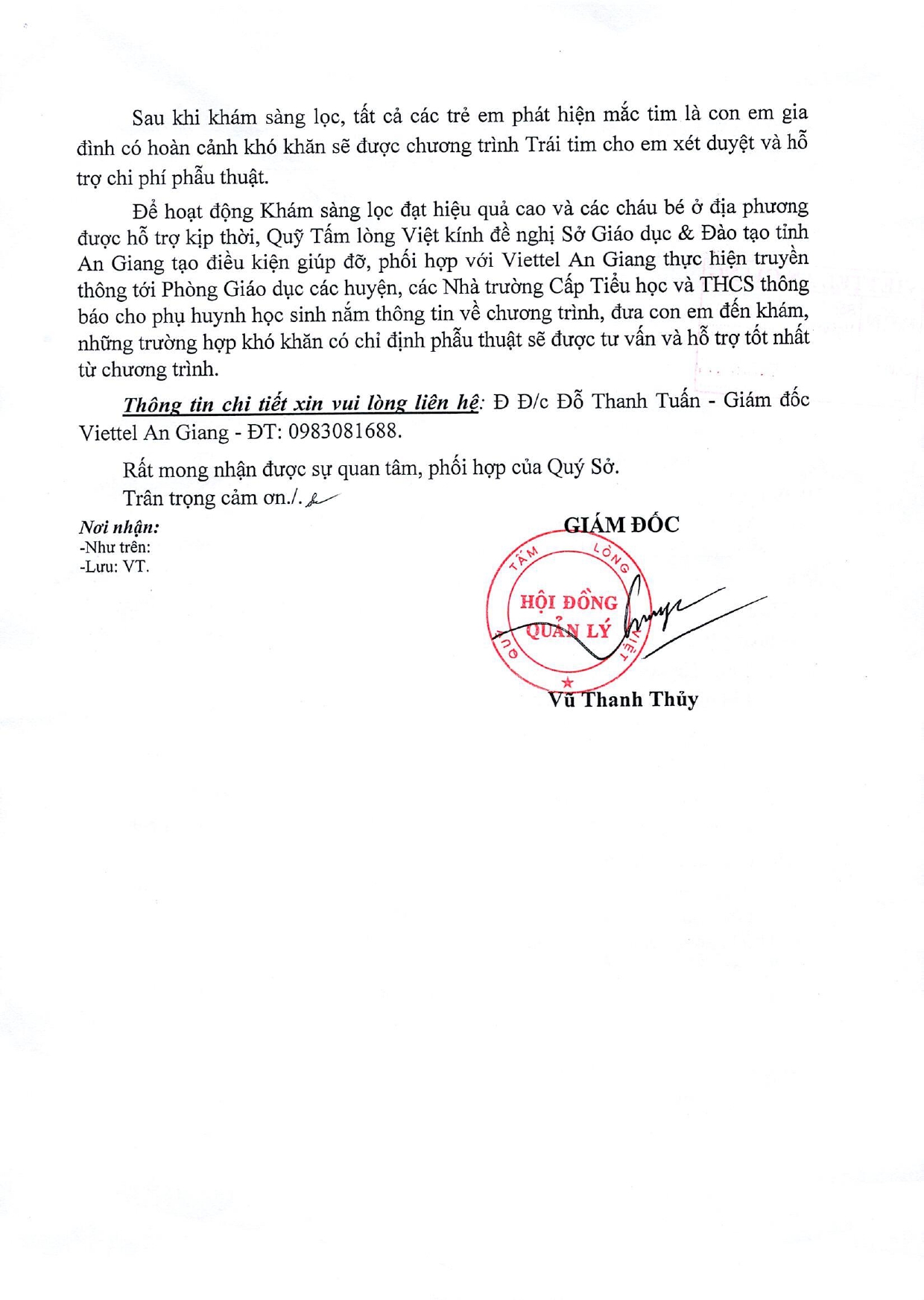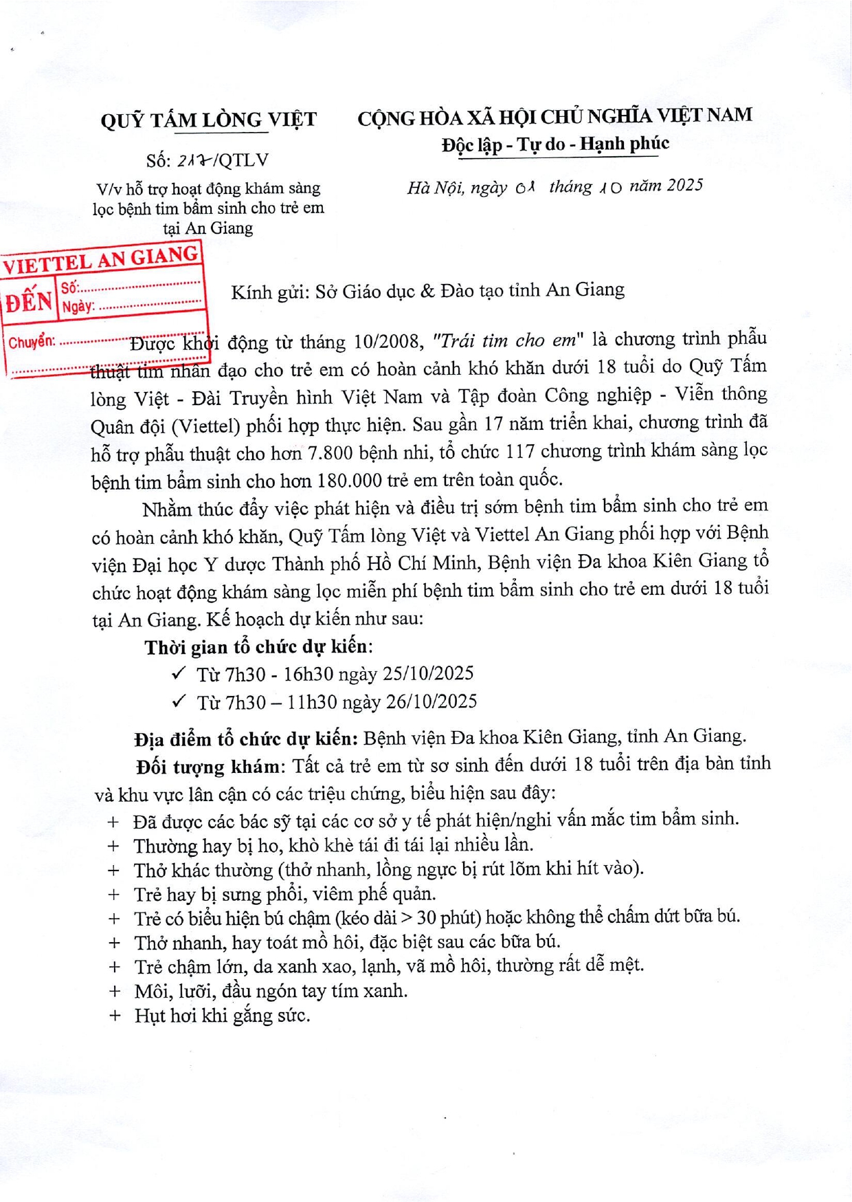 Công văn về việc hỗ trợ hoạt động khám sàng lọc bệnh tim bẩm sinh cho trẻ em tại An Giang
