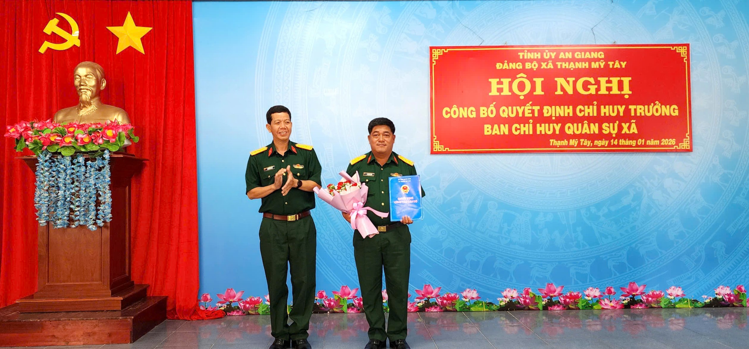 Ngày 14/01/2026, Đảng ủy xã Thạnh Mỹ Tây tổ chức hội nghị công bố quyết định về công tác cán bộ, kiện toàn chức danh Chỉ huy trưởng Ban Chỉ huy Quân sự xã.