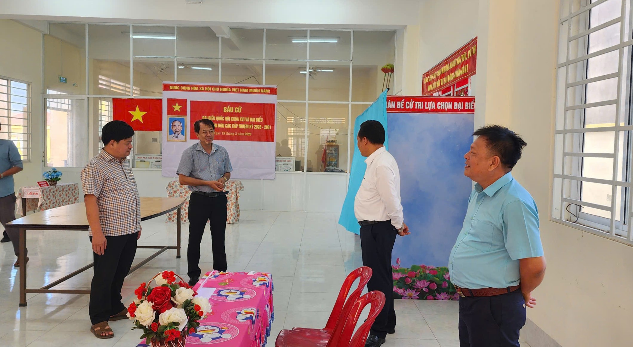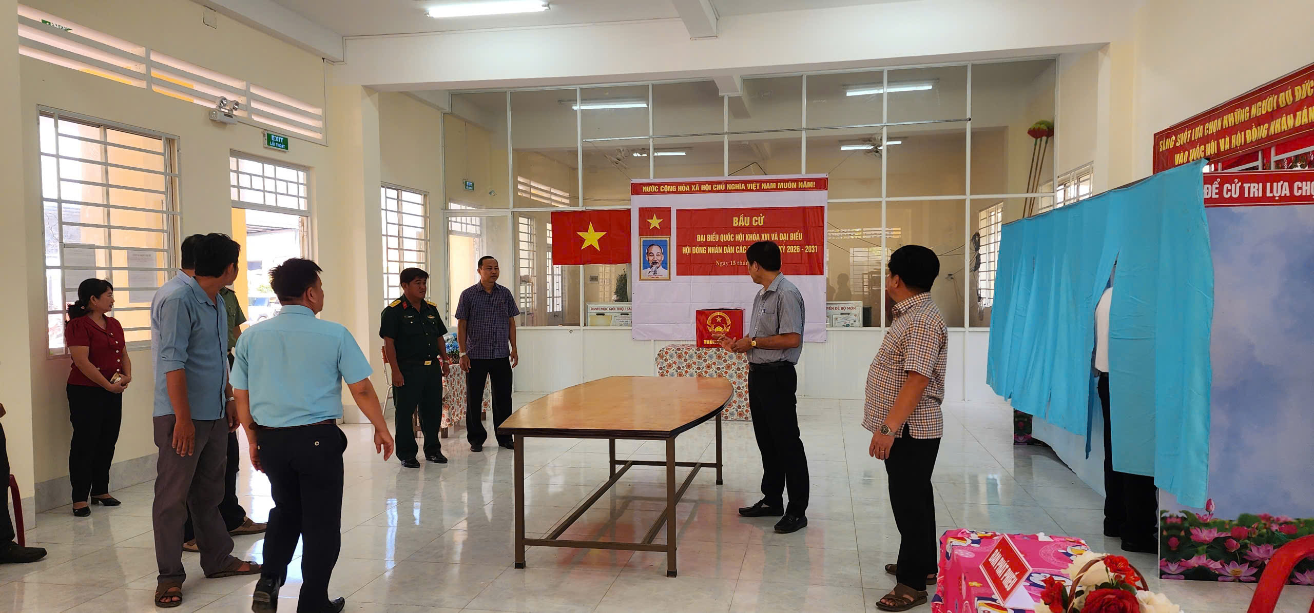 Tại đây, đoàn công tác đã trực tiếp đến kiểm tra thực tế tại các điểm bỏ phiếu trên địa bàn xã, tập trung xem xét việc bố trí khu vực bỏ phiếu, công tác trang trí, khánh tiết, niêm yết danh sách cử tri và danh sách ứng cử viên, cũng như việc chuẩn bị các điều kiện cần thiết phục vụ ngày bầu cử, chủ nhật ngày 15/3/2026.
