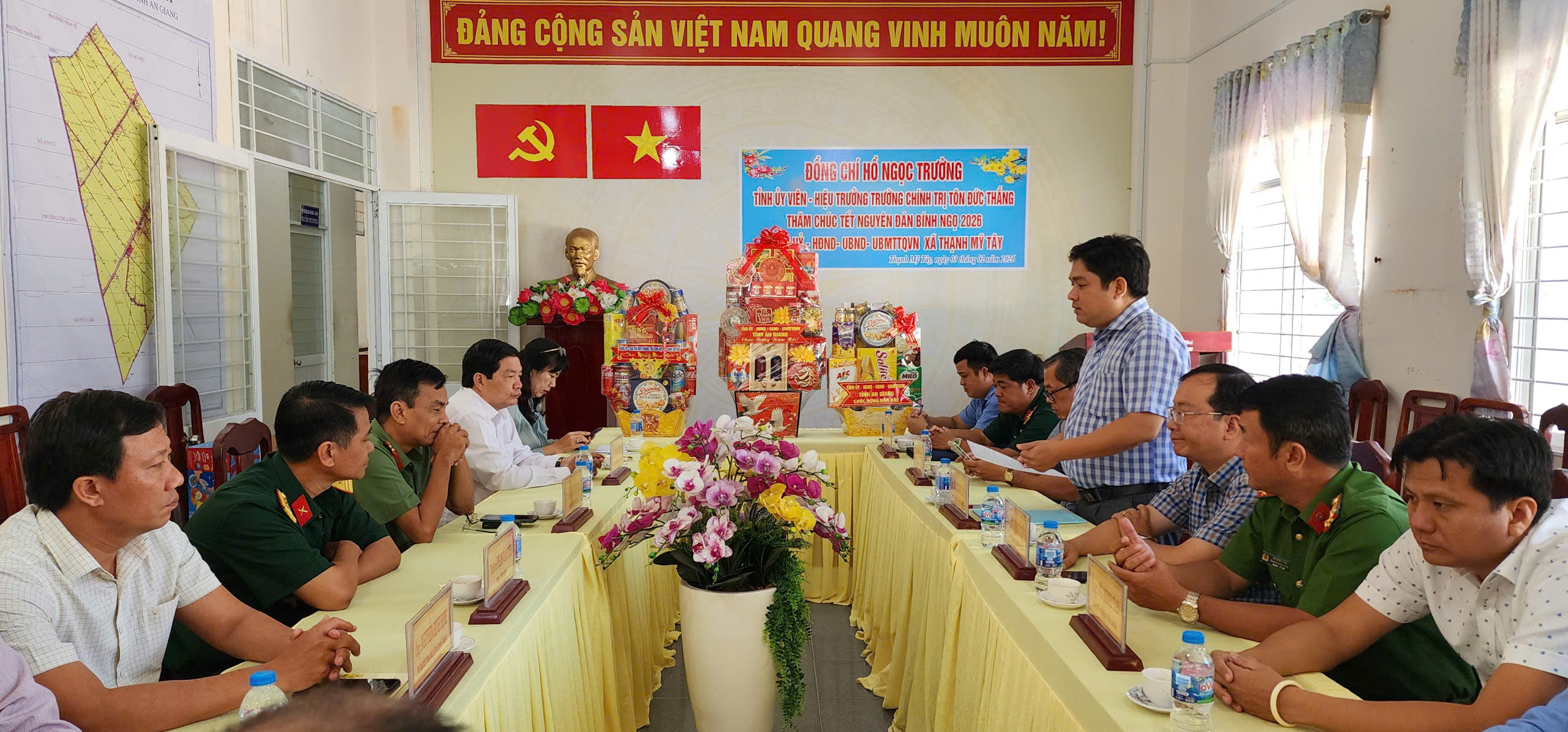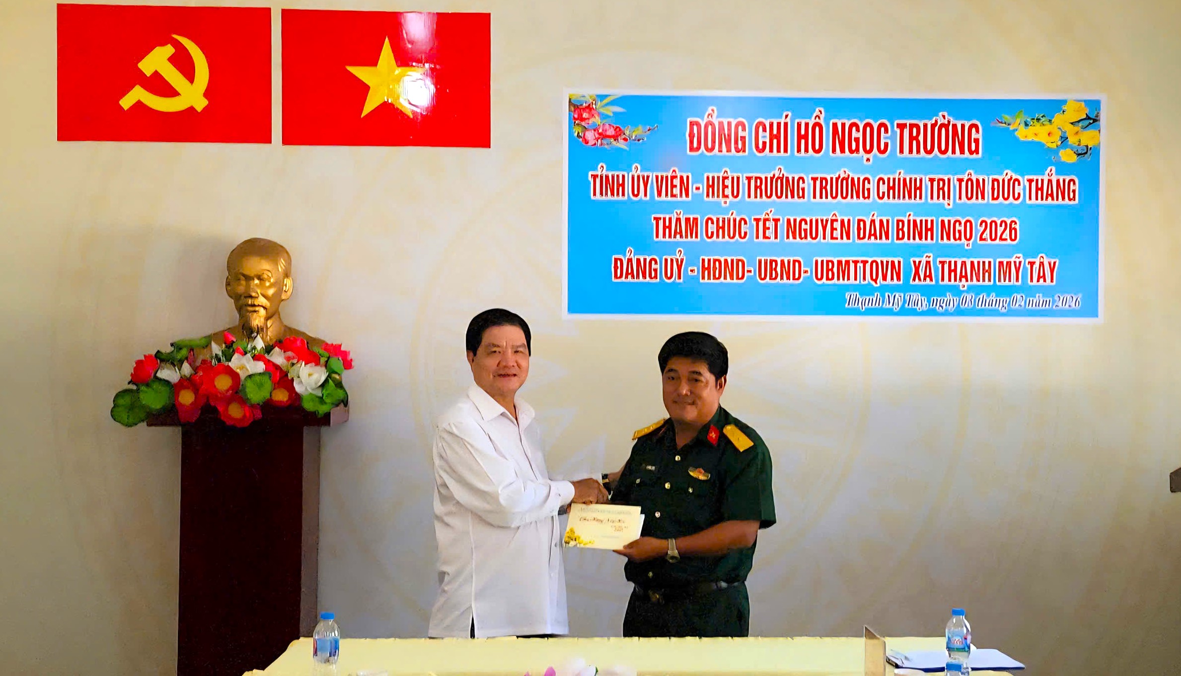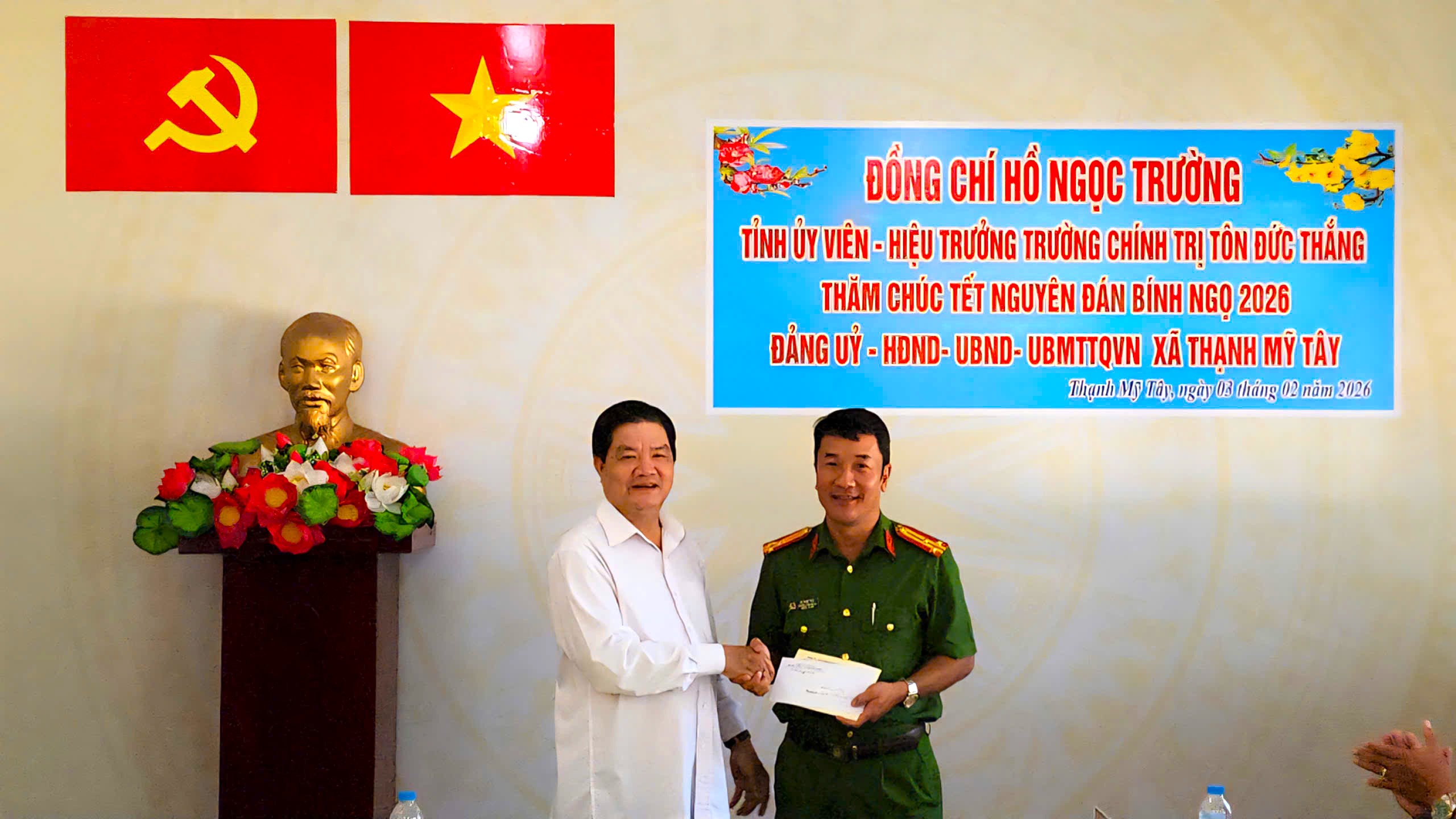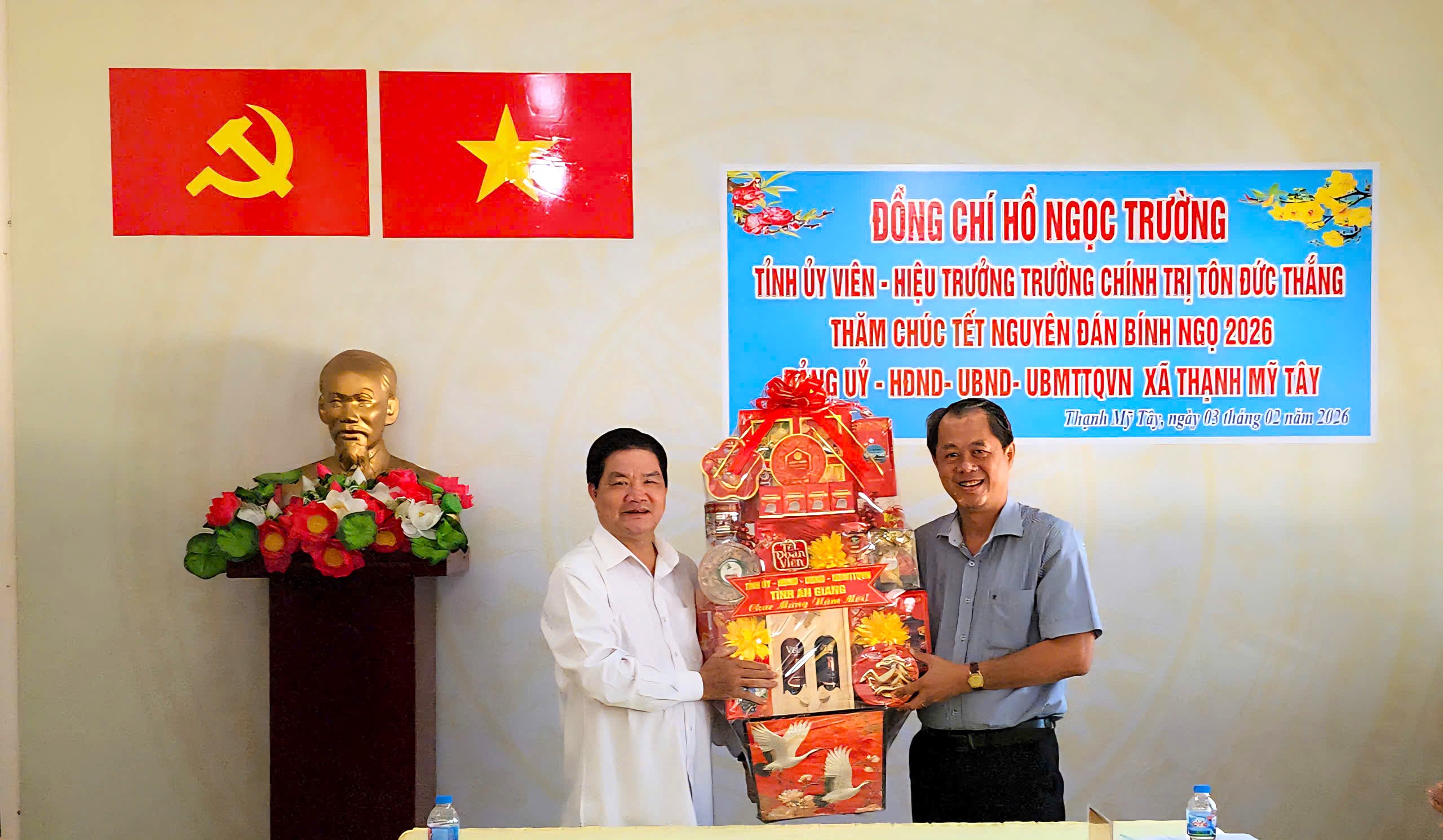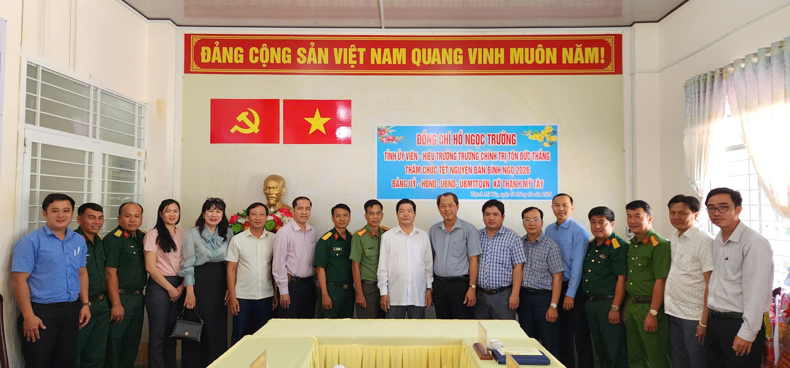 Nhân dịp Tết Nguyên đán Bình Ngọ năm 2026, ngày 03/02/2026, đồng chí Hồ Ngọc Trường, Tỉnh ủy viên – Hiệu trưởng Trường Chính trị Tôn Đức Thắng  làm trưởng đoàn đã đến thăm, chúc Tết Đảng ủy – HĐND – UBND – Ủy ban MTTQ Việt Nam xã Thạnh Mỹ Tây.