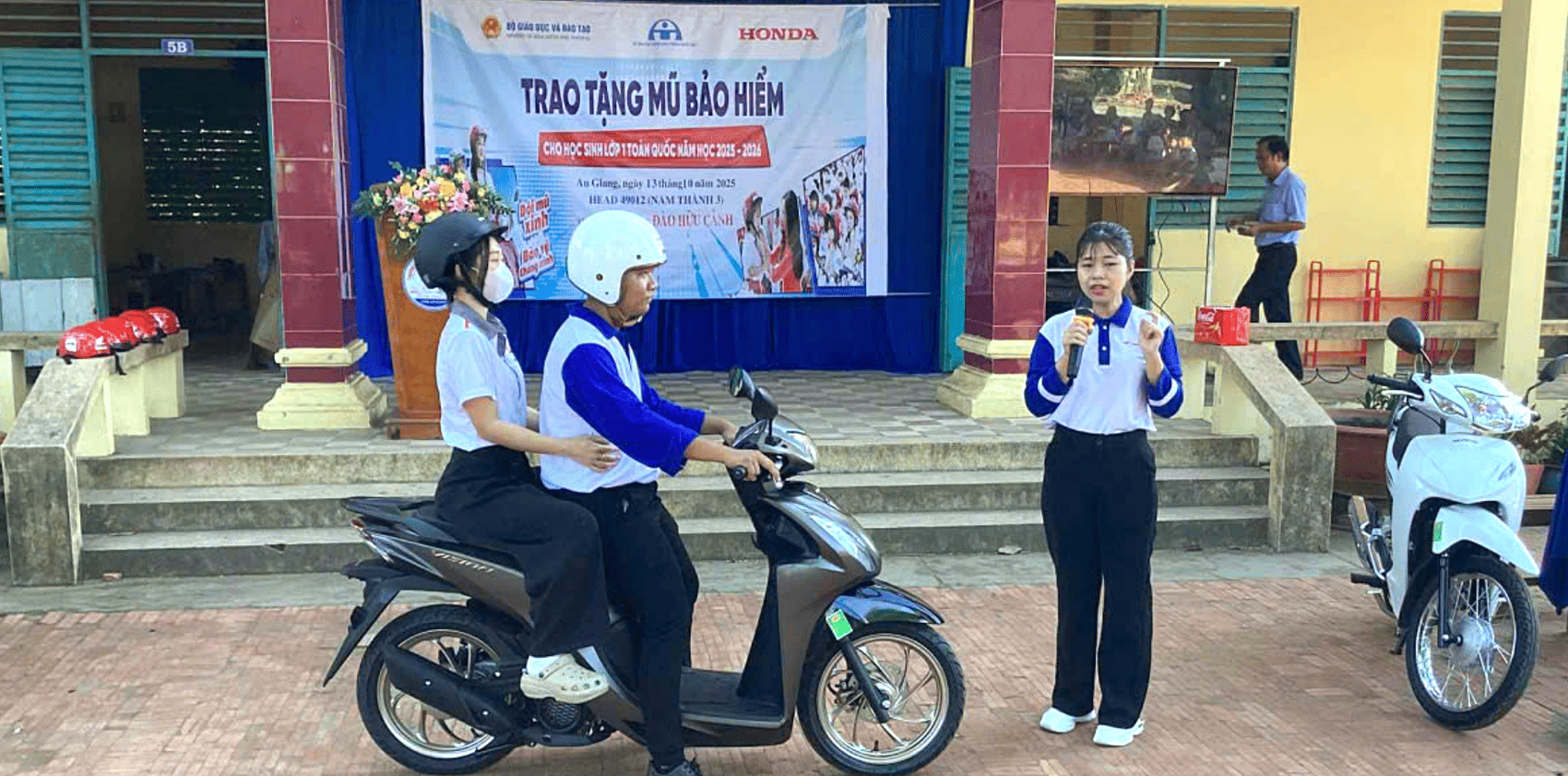 Hướng tới tỷ lệ đội mũ bảo hiểm đối với trẻ em đạt 100% vào năm 2030, trong năm học 2025 – 2026, Honda Việt Nam tài trợ cho các em học sinh lớp 1 của toàn xã Thạnh Mỹ Tây 600 em tổng giá trị gần 60 triệu đồng. Tại chương trình, Cửa hàng Honda HEAD Nam Thành 3 đã trao tặng 128 mũ bảo hiểm cho học sinh lớp 1, với tổng trị giá hơn 10 triệu đồng. Ngoài phần trao tặng, học sinh còn được hướng dẫn các kỹ năng tham gia giao thông an toàn, giúp hình thành thói quen đội mũ bảo hiểm khi ngồi trên xe mô tô, xe gắn máy. Hoạt động nhằm nâng cao nhận thức và hình thành thói quen đội mũ bảo hiểm đạt chuẩn cho trẻ em khi tham gia giao thông, góp phần thực hiện mục tiêu “Không còn tử vong do tai nạn giao thông đường bộ” vào năm 2045.