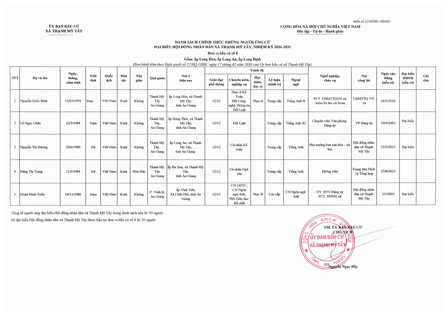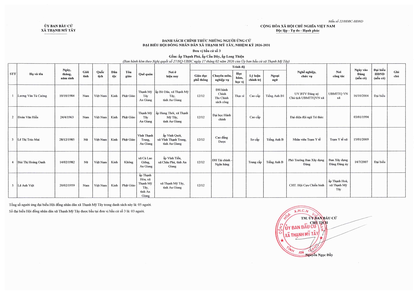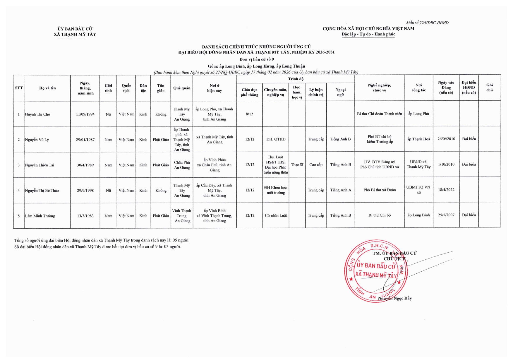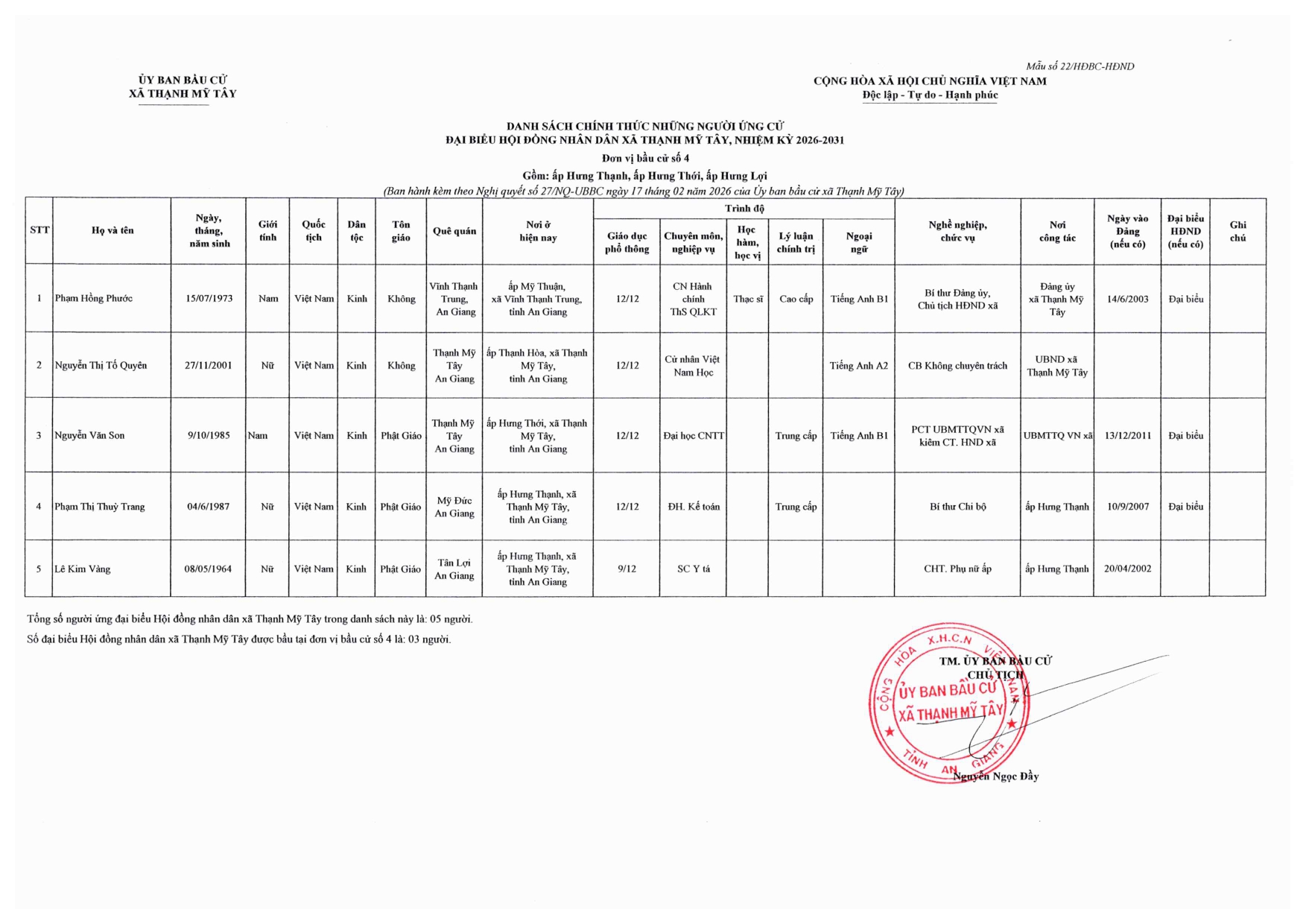 Nghị quyết công bố danh sách chính thức những người ứng cử đại biểu Hội đồng nhân dân xã Thạnh Mỹ Tây, nhiệm kỳ 2026-2031 theo từng đơn vị bầu cử trên địa bàn xã
