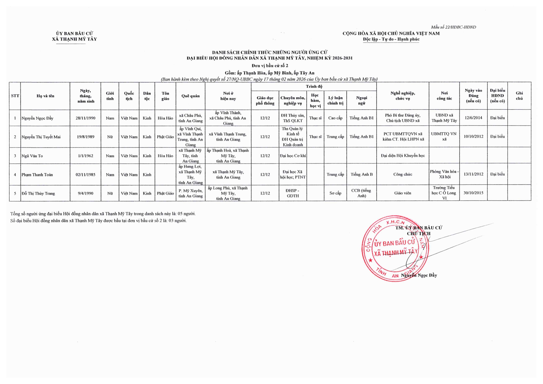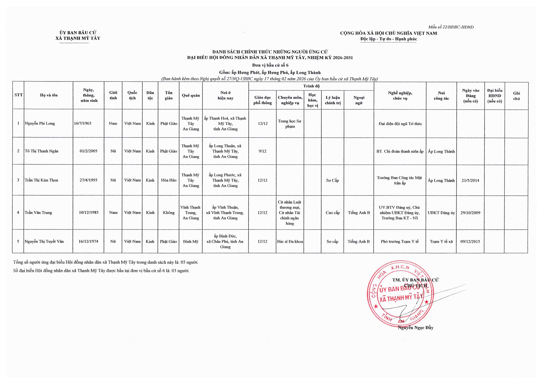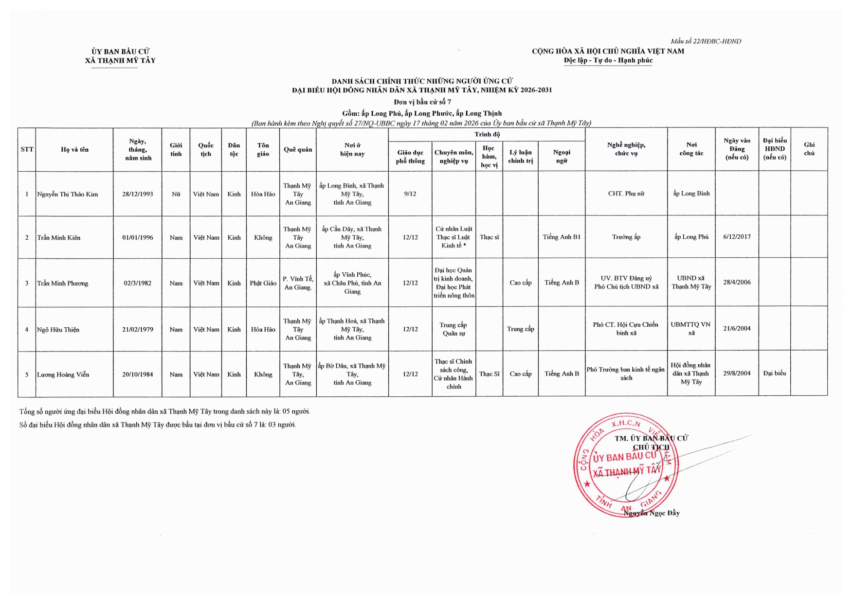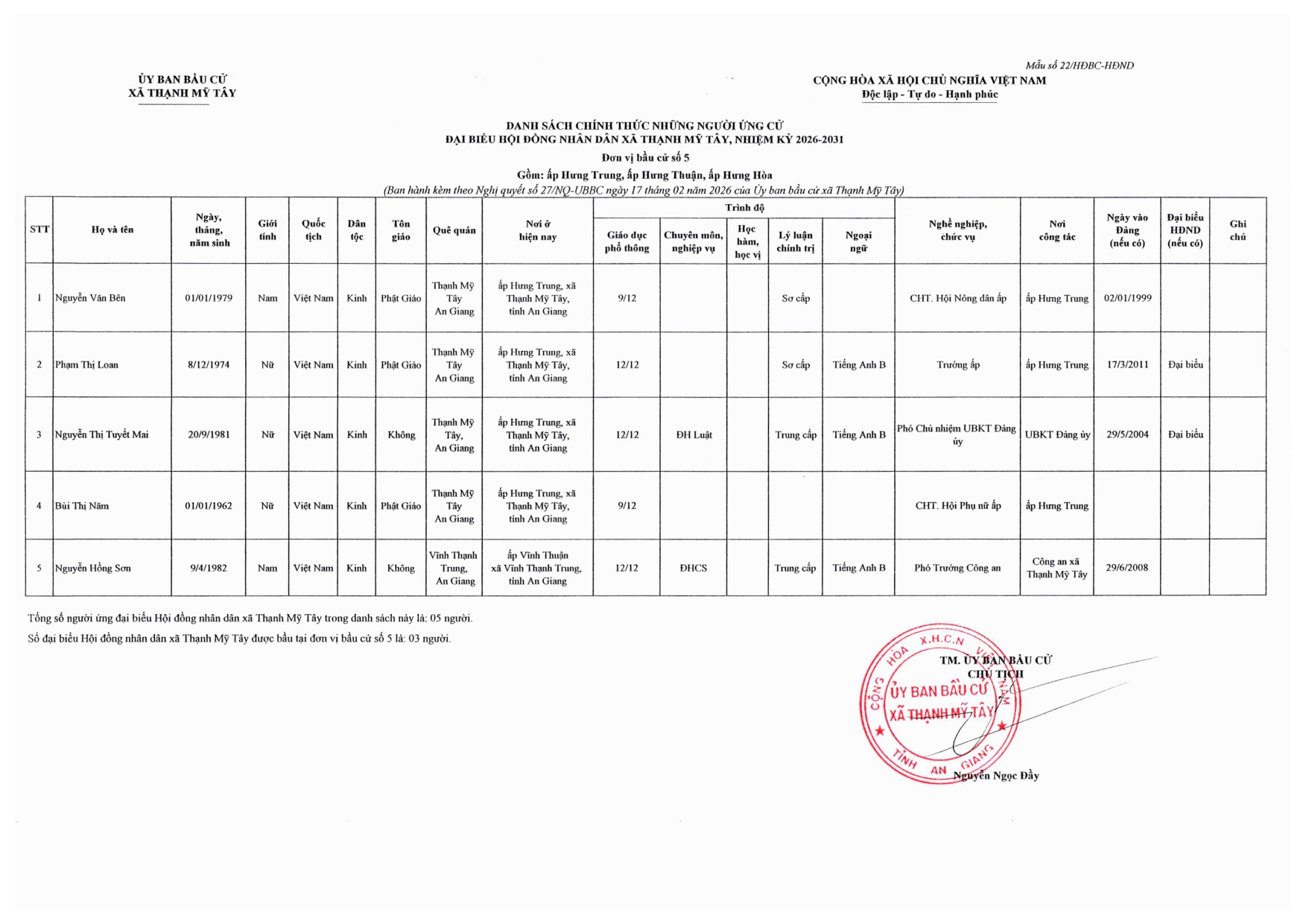 Nghị quyết công bố danh sách chính thức những người ứng cử đại biểu Hội đồng nhân dân xã Thạnh Mỹ Tây, nhiệm kỳ 2026-2031 theo từng đơn vị bầu cử trên địa bàn xã