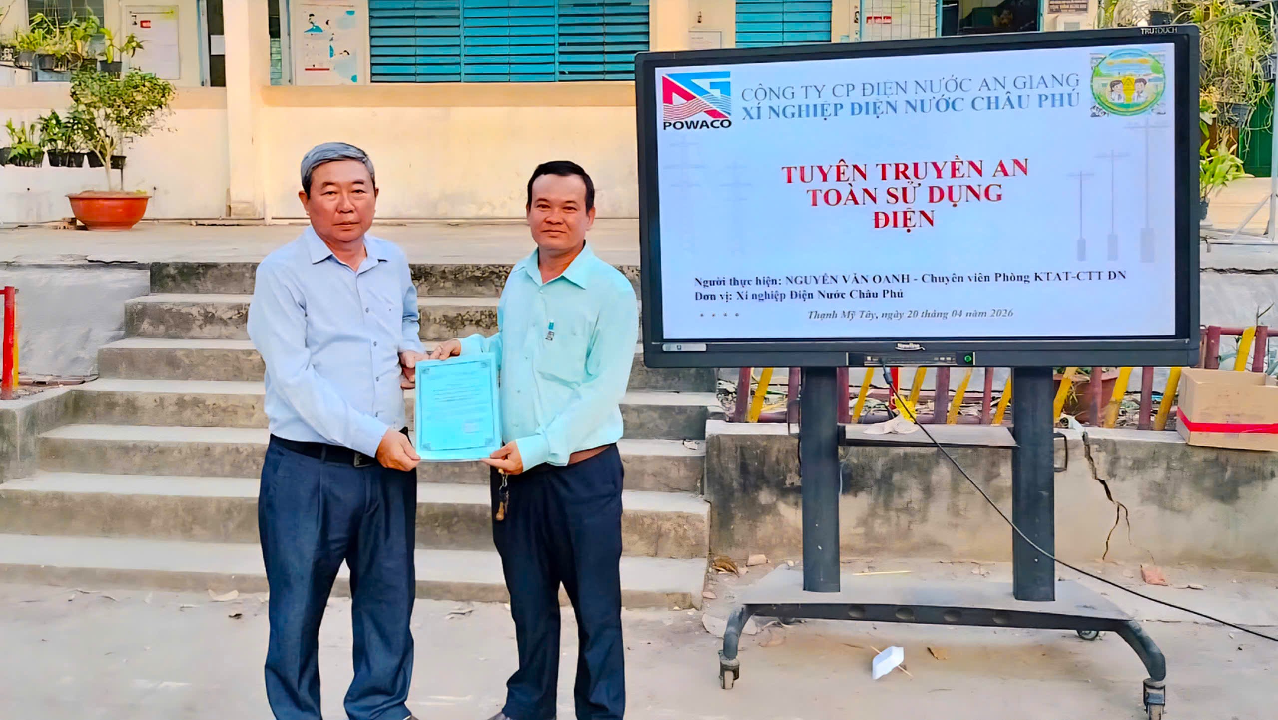 Ngày 20/4/2026, Xí nghiệp Điện nước Châu Phú phối hợp Trường THCS Đào Hữu Cảnh (xã Thạnh Mỹ Tây) tổ chức tuyên truyền về sử dụng điện an toàn và tiết kiệm cho cán bộ, giáo viên và học sinh nhà trường.