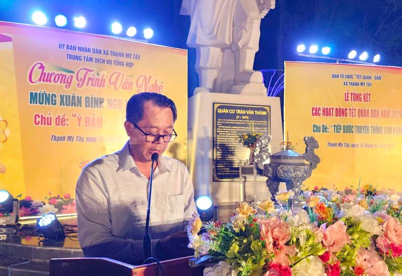 Ngày 14/02/ 2026, Ủy ban nhân dân xã Thạnh Mỹ Tây tổ chức Lễ tổng kết các hoạt động “Tết Quân – Dân” năm 2026 với chủ đề “Tiếp bước truyền thống anh hùng”, nhằm ôn lại truyền thống cách mạng vẻ vang của dân tộc, phát huy tinh thần đoàn kết quân – dân, đồng thời đánh giá kết quả thực hiện, ghi nhận sự đóng góp của các cá nhân đồng hành trong suốt chuỗi hoạt động chăm lo Tết cho Nhân dân trên địa bàn xã trong dịp Tết Nguyên đán.