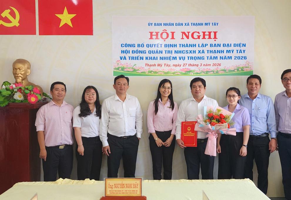 Ngày 27/3/2026, Ủy ban nhân dân xã Thạnh Mỹ Tây tổ chức Hội nghị công bố Quyết định thành lập Ban đại diện Hội đồng quản trị Ngân hàng Chính sách xã hội xã Thạnh Mỹ Tây và triển khai nhiệm vụ trọng tâm năm 2026.