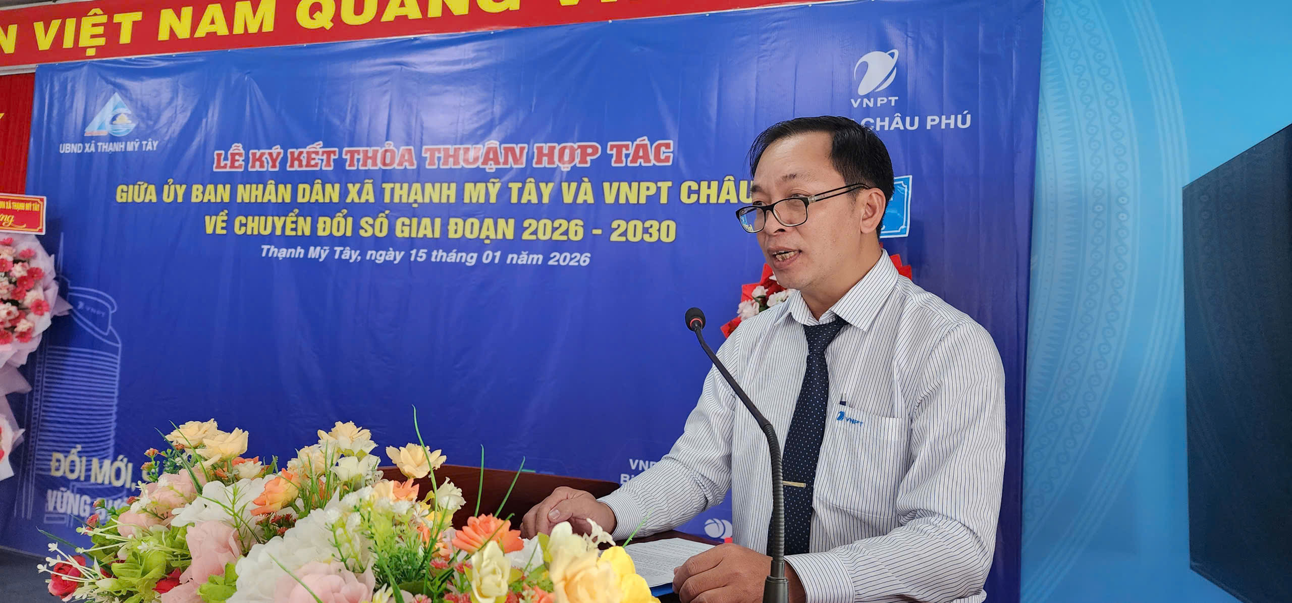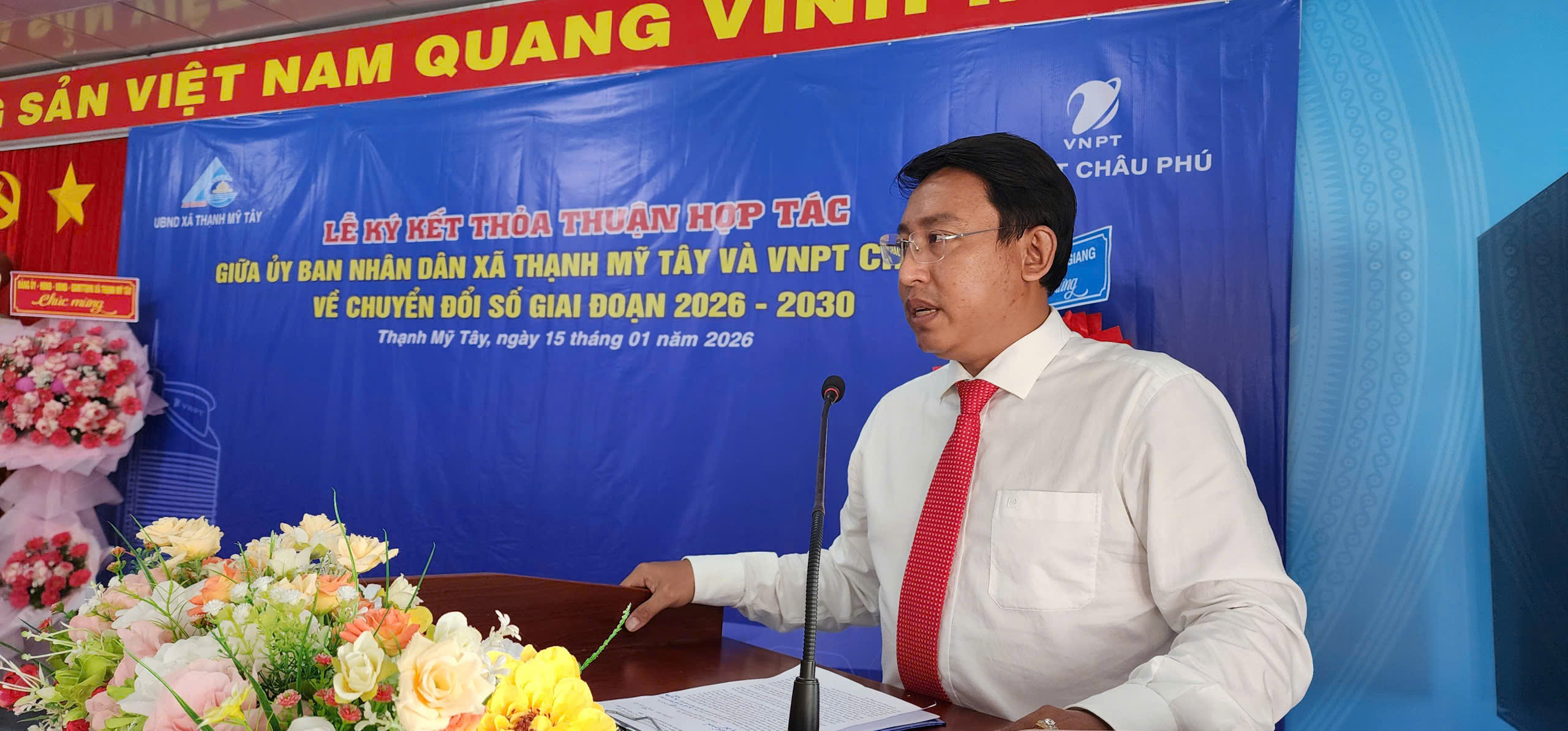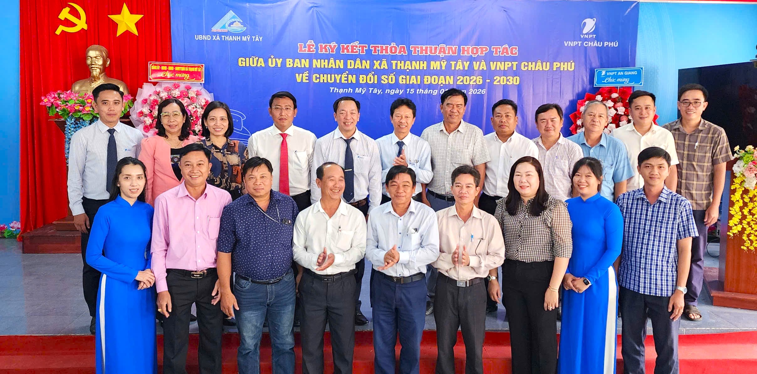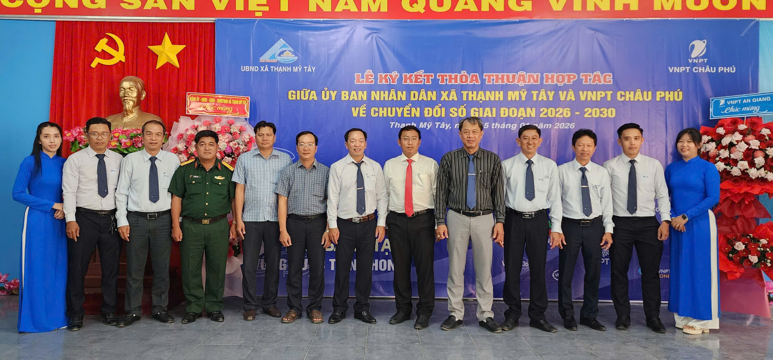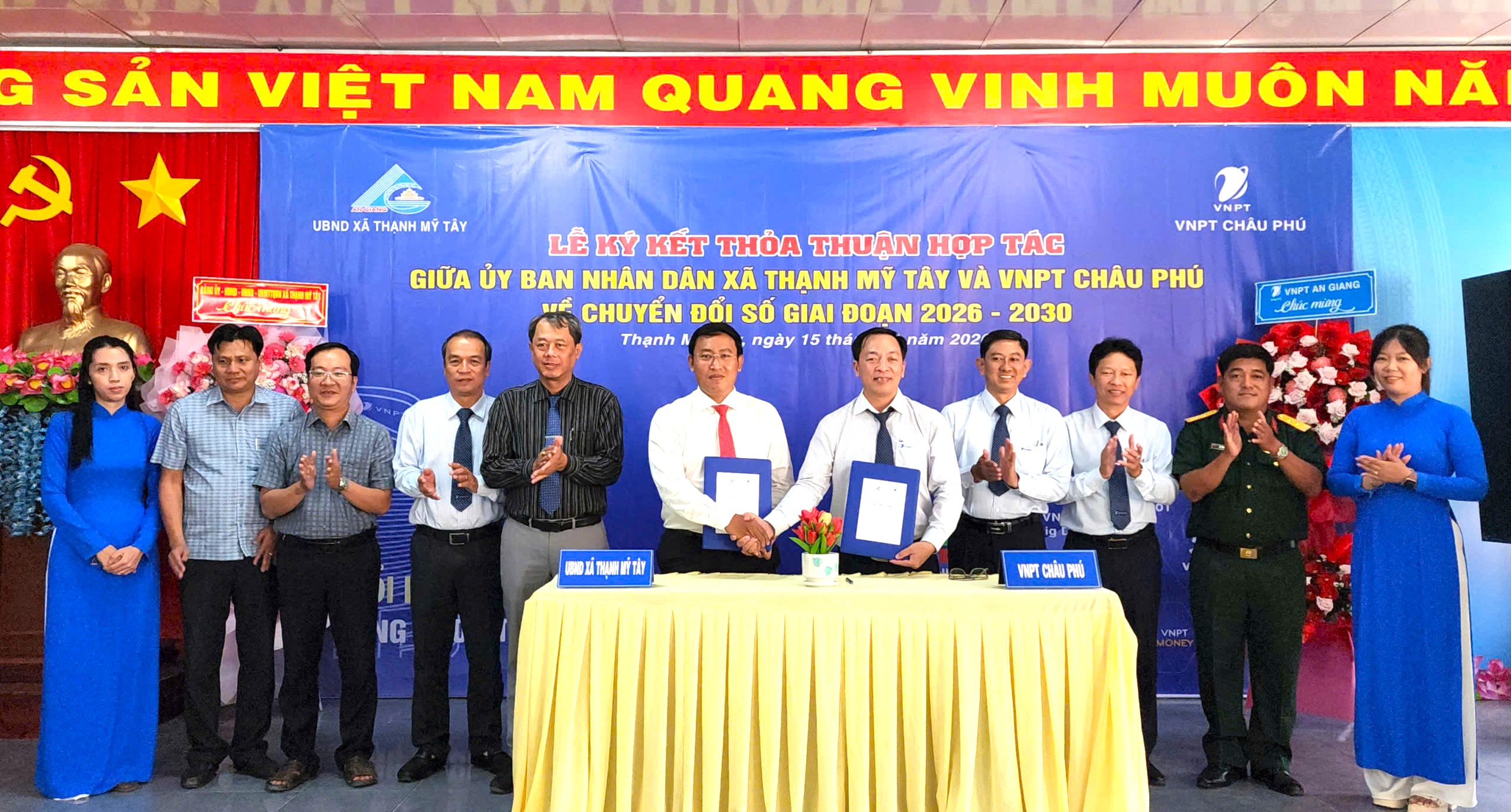 Nhằm cụ thể hóa chủ trương chuyển đổi số gắn với phát triển kinh tế – xã hội ở cơ sở, ngày 15/01/2026, Ủy ban nhân dân xã Thạnh Mỹ Tây tổ chức Lễ ký thỏa thuận hợp tác chuyển đổi số giai đoạn 2026 – 2030 giữa Ủy ban nhân dân xã Thạnh Mỹ Tây và VNPT Châu Phú.