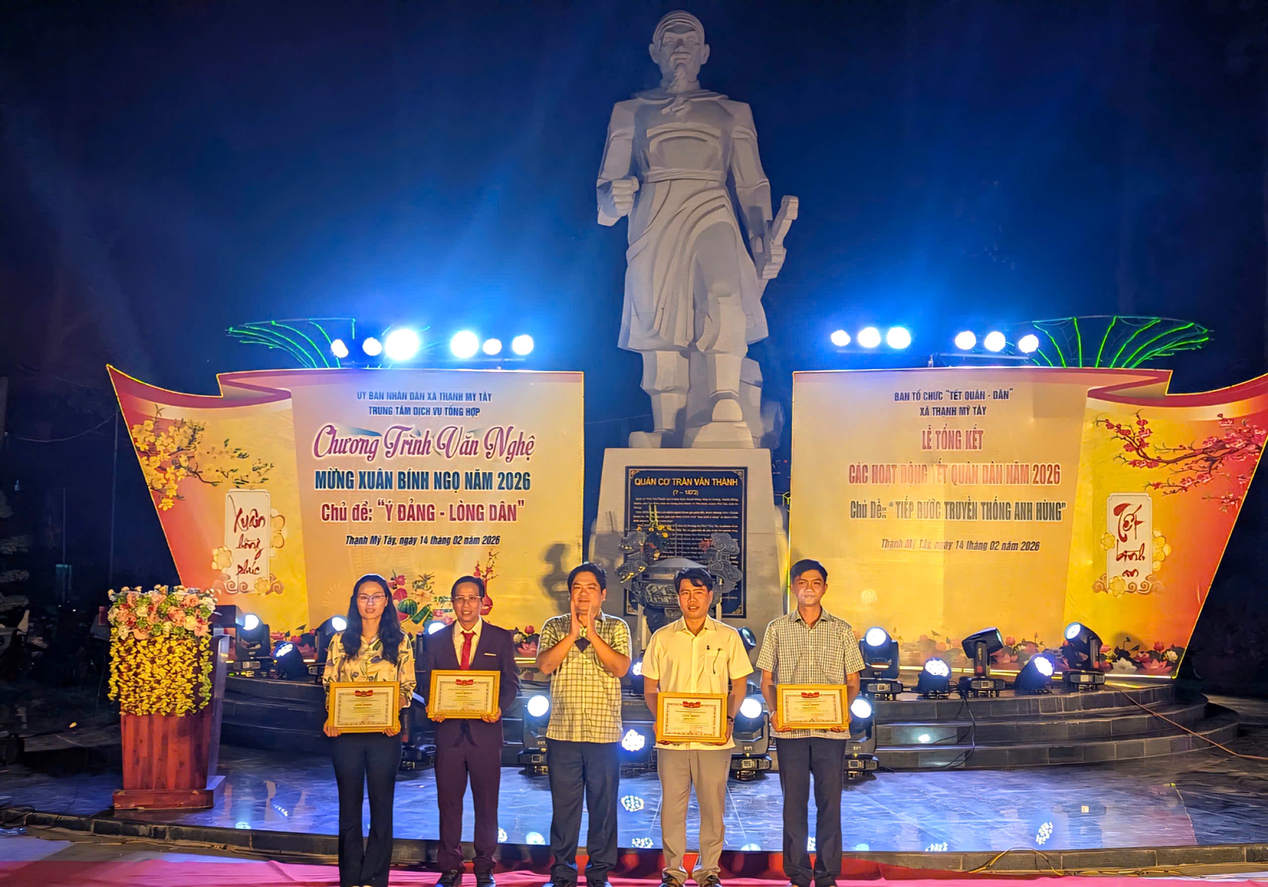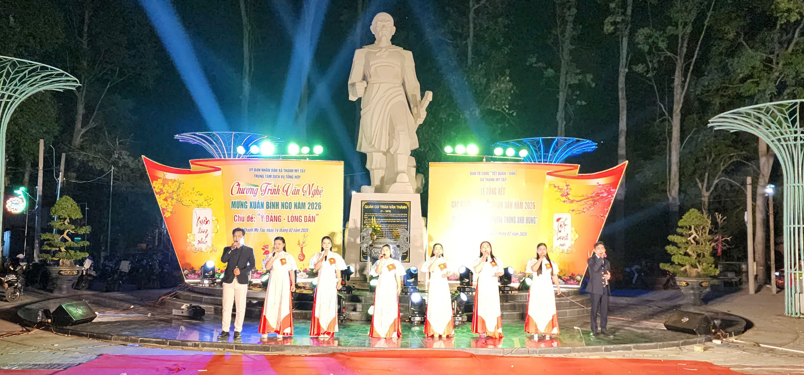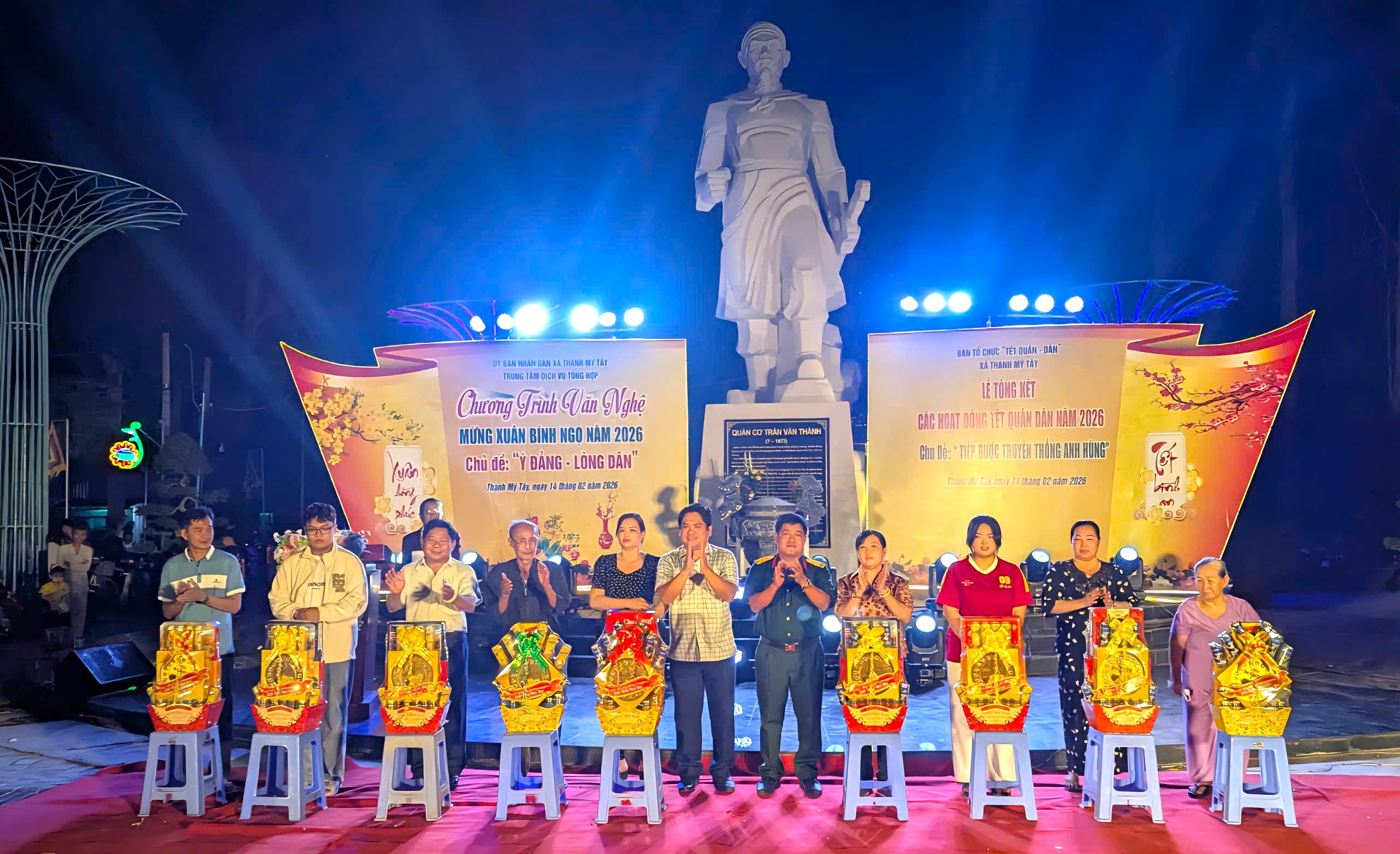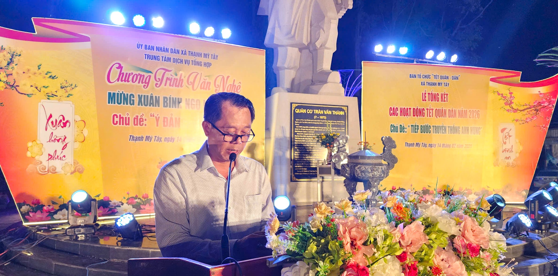 Ngày 14/02/ 2026, Ủy ban nhân dân xã Thạnh Mỹ Tây tổ chức Lễ tổng kết các hoạt động “Tết Quân – Dân” năm 2026 với chủ đề “Tiếp bước truyền thống anh hùng”, nhằm ôn lại truyền thống cách mạng vẻ vang của dân tộc, phát huy tinh thần đoàn kết quân – dân, đồng thời đánh giá kết quả thực hiện, ghi nhận sự đóng góp của các cá nhân đồng hành trong suốt chuỗi hoạt động chăm lo Tết cho Nhân dân trên địa bàn xã trong dịp Tết Nguyên đán.